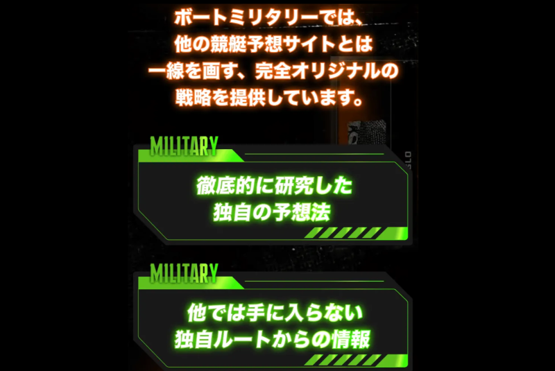 更に読み進めていくと、以下のような文章で、ボートミリタリーは他の競艇予想サイトと違う点をアピール。