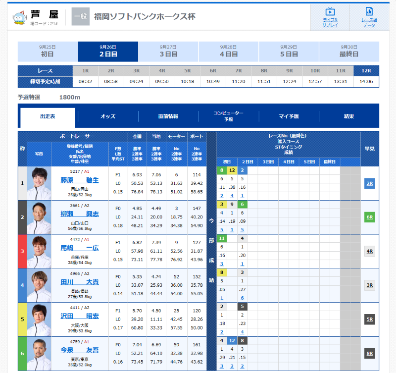 成績などを見ると、6号艇の今泉選手が一番上ですが、さすがに6コースのハンデを覆すのは厳しいでしょう。3号艇・5号艇選手が1回フライングしているのも気になるところで、この2選手は思い切ったスタートがしづらいはず。