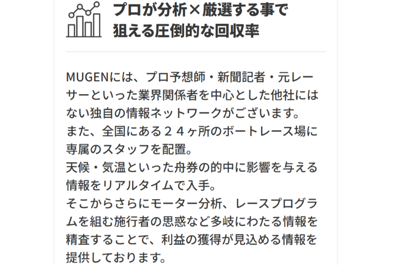 ポイント進呈の説明の後には的中実績が紹介され、競艇MUGENが選ばれている理由として以下の2つを紹介していました。